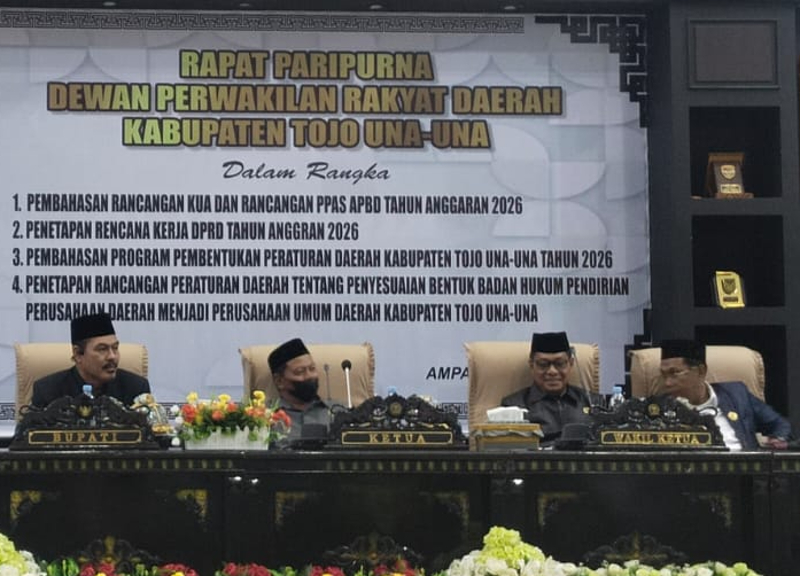 TOUNA – Sekretaris Daerah (Sekda) Kabupaten Tojo Una-Una, Alfian Matajeng menghadiri Rapat Paripurna Dewan Perwakilan Rakyat Daerah (DPRD) Kabupaten Tojo Una-Una dalam rangka pembahasan 4 agenda penting, di Ruang Sidang Utama DPRD setempat, Rabu (6/11/2025) malam.